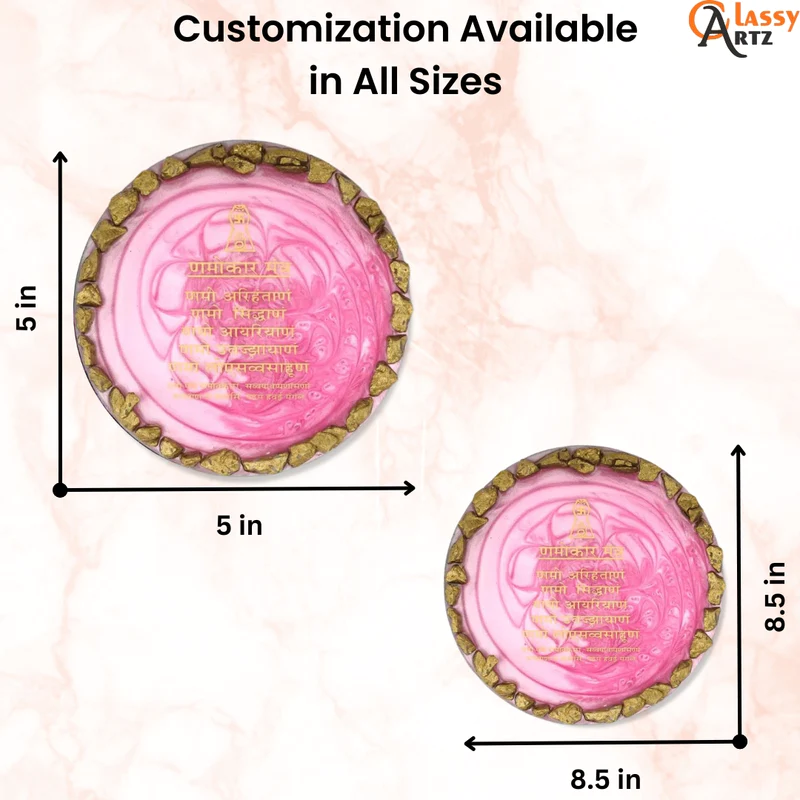 Elevate your living spaces with our Resin Mini Jain Navkar Mantra Frame in Royal Pink Round design. This exquisite piece seamlessly blends luxury and cultural significance, making it a stunning addition to your home or office. Crafted for aesthetic appeal, it resonates with Vastu/Feng Shui principles, infusing positive energy, promoting stress reduction, and enhancing focus.